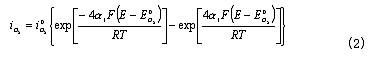 因氧氣分壓較大,一般由電荷傳輸過程控制,根據Butler-Volmer方程得到反應速率為: