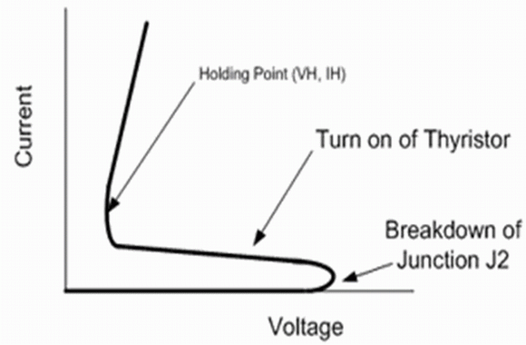 晶閘管的過壓保護設(shè)備是基于一對雙極性晶體管,這一對雙極性晶體管是由四層不同摻雜的N,P極組成,如圖1所示。N型摻雜的N1,P型摻雜的P1,和N型摻雜的N2分別構(gòu)成NPN晶體管的發(fā)射極,基極和收集極,而P型摻雜的P2,N型摻雜的N2,和P型摻雜的P1分別構(gòu)成了PNP晶體管的發(fā)射極,基極,和收集極。這樣一來一個晶體管的收集極是另外一個晶體管的基極。按這種方法那么一個晶體管的發(fā)射極到收集極流過的電流就是流向另一個晶體管的基極的電流。如果加一個從陽極到陰極的正電壓,那兩個三極管的發(fā)射極與基極之間,即J1和J3,都是正向電壓偏置。只有J2處PN結(jié)形成反向電壓偏置時才能阻礙電流流動。如果從陽極到陰極的電壓增加到大于J2處PN結(jié)的擊穿電壓,電流就開始直接流向兩個雙極性晶體管的基極。這使得兩個三極管都導(dǎo)通,會導(dǎo)致含有兩個三極管的晶閘管的電阻下降,并且晶閘管兩端的電壓也會減小。如圖2所示我們可以看到晶閘管的從陽極到陰極的正電流存在時的電壓-電流曲線。有著這樣的電壓-電流曲線特性的保護器件一定會有非常優(yōu)秀的保護特性。當(dāng)保護器件在觸發(fā)后,工作電壓下降時保護器件可以承受大的電流并且自身功耗很小。事實上,具有這種電壓-電流曲線特性的保護器件通常被稱為“消弧”保護器件,因為這就好比是通過把一個“金屬消弧”放置在需要保護的端口來實現(xiàn)保護作用的。值得注意的是只有當(dāng)電流或者電壓降到閾值點以下,才能使得晶閘管回到高阻態(tài),如圖2所示。