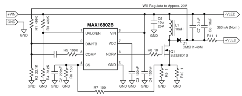步驟6:R1和R2可選。它們用于調(diào)整+VLED至29V。這在輸出端出現(xiàn)意外開路時非常有用。如果沒有上述元件的分壓,輸出電壓有可能上升,導(dǎo)致器件損壞。