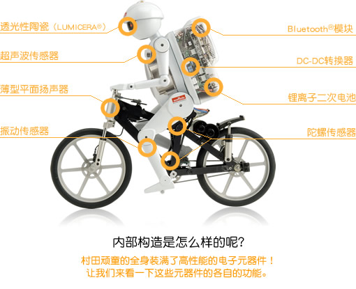 村田制作所在本屆高交會(huì)上展示了會(huì)騎單車的小機(jī)器人——村田頑童,每次演示都吸引了大量觀眾。村田頑童是村田制作所2005年發(fā)布的,至今已經(jīng)3周歲,但是他那精湛的騎單車技術(shù)仍然吸引了眾多觀眾的駐足。