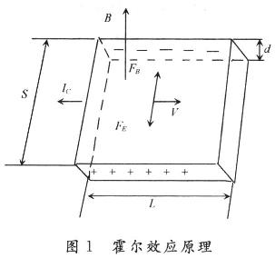 如圖1所示,一個N型半導體薄片,長度為L,寬度為S,厚度為d,在垂直于該半導體薄片平面的方向上,施加磁感應強度為B的磁場,若在長度方向通以電流Ic則運動電荷受到洛倫茲力的作用,正負電荷將分別沿垂直于磁場和電流的方向向?qū)w兩端移動,并聚集在導體兩端形成一個穩(wěn)定的電動勢UH,這就是霍爾電動勢(或稱之為霍爾電壓),這種現(xiàn)象稱為霍爾效應?;魻栯妷旱拇笮H=RIB/d=KHICB,其中R為霍爾常數(shù);KH為霍爾元件的乘積靈敏度。