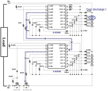 下面,詳細(xì)介紹一下保護(hù)芯片級聯(lián)的具體工作情況。還是以S-8204B為例,其CTLC端子可由芯片外部控制COP端子的輸出電壓、而CTLD端子則可由芯片外部控制DOP端子的輸出電壓。通過CTLC端子以及CTLD端子可以分別單獨(dú)控制COP端子與DOP端子的輸出電壓。并且,這些控制功能優(yōu)先于芯片內(nèi)部的電池充放電保護(hù)功能。如果8節(jié)電池中的某一節(jié)電池發(fā)生過充,與該電池相連接的S-8204B的COP端子輸出電壓會發(fā)生變化,該電壓變化會傳遞到與其相連接的另一個(gè)S-8204B的CTLC端子,使得另一個(gè)S-8204B的COP端子輸出電壓也發(fā)生變化,從而控制充電控制用MOSFET關(guān)斷,實(shí)現(xiàn)鋰離子電池的過充電保護(hù)。