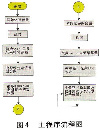 圖4示出主程序流程圖,圖5示出定時中斷流程圖。為減少功耗和保護電機,設(shè)置了自動半電流功能(靜態(tài)鎖軸或沒有脈沖輸入時電流減半),它由滯環(huán)比較器自動進行調(diào)節(jié)。