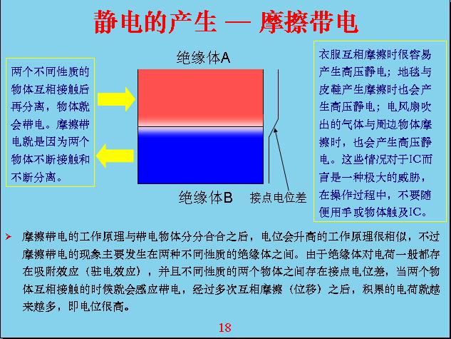 舉一個(gè)具體的例子,比如說我現(xiàn)在這個(gè)人站在地上,我是光著腳,地板是導(dǎo)電的,這個(gè)椅子是絕緣的,我從地面一站到椅子上就相當(dāng)于我?guī)щ娏恕槭裁??因?yàn)槲以瓉硎菢O化帶電,上面帶負(fù)電,下面帶正電,我站在地上下面就變成零,上面變成了-100v,站上去的時(shí)候相對(duì)來說我就變成帶電的人。所以,很多在半導(dǎo)體車間或者和集成電路接觸、打交道的人,不要隨隨便便用人摸集成電路,因?yàn)槟氵@個(gè)人不知不覺就帶電了,你從門外面走進(jìn)房子里很可能就帶電了,在上樓梯或者地板鋪有一層絕緣的東西,在絕緣以外的時(shí)候你不帶電,站上去就帶電了,因?yàn)樯厦嬗须妼印_€有空調(diào)的風(fēng)吹出來的空氣會(huì)和你身體上面的衣服進(jìn)行摩擦、感應(yīng),它容易帶電,用靜電筆來測(cè),隨便碰衣服或頭發(fā),上面帶的電基本上都有300v左右,如果摩擦幾下大概就有4000-5000v,所以靜電感應(yīng)是相當(dāng)厲害的,很多模型電路在送到工廠的時(shí)候就是用盒子包裝,因?yàn)楹凶邮菍?dǎo)電的,如果用電表去量它好像沒有電阻,電阻是無窮大,其實(shí)它是導(dǎo)電的,相對(duì)來說電導(dǎo)率很低,也就是電阻很大。