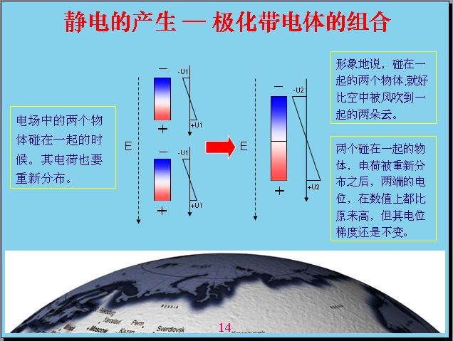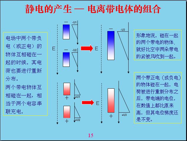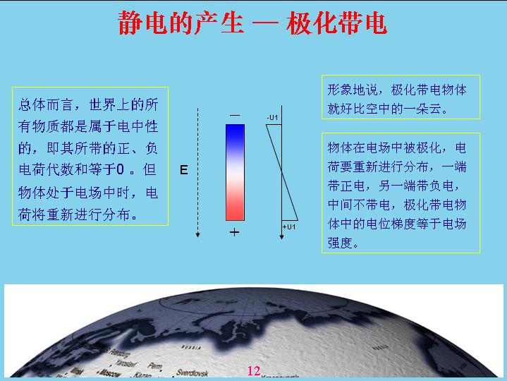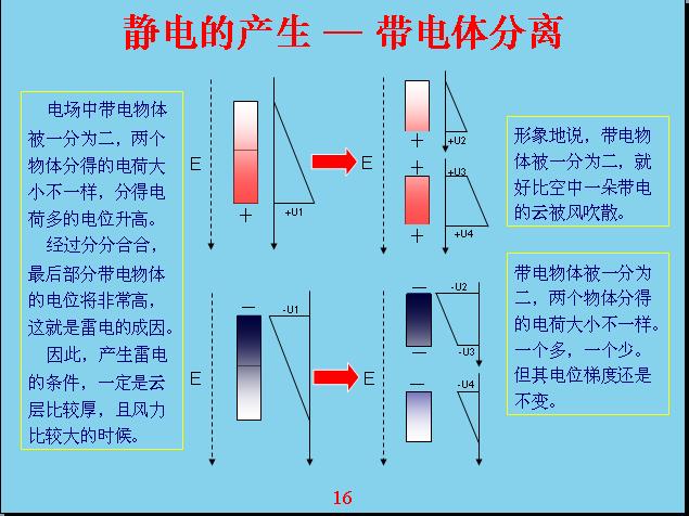 由于地球是帶電的,相對(duì)電容層來說。一個(gè)物體在地球空間里面就會(huì)受到電場(chǎng)的作用產(chǎn)生極化,什么叫極化?就是說一個(gè)物體原來是不帶電的,現(xiàn)在產(chǎn)生極化帶電,一端帶正電,一端帶負(fù)電。比如說這個(gè)源相當(dāng)于一個(gè)導(dǎo)體,如果底下是絕緣的話,上面如果沒有屏蔽,我的上面就帶負(fù)電,下面帶正電,中間這個(gè)地方是不帶電的,人相對(duì)來說還是偏中性,但是雖然極化帶電的,但我總得來說還是變中性,帶的正電和負(fù)電都是相等的。如果把原來極化帶電的物體分成兩個(gè),這兩個(gè)都會(huì)帶電。形象地說,一朵云在電場(chǎng)作用下極化帶電,但沒有產(chǎn)品電流,電感強(qiáng)度沒有達(dá)到這么高,如果把它分成兩塊就會(huì)產(chǎn)生電容帶電?,F(xiàn)在由于風(fēng)的作用,把它一吹變成兩塊,中間的地方分成兩塊,有一塊相當(dāng)于帶負(fù)電,有一塊帶正電。這就表示電位曲線,中間這個(gè)地方表示電位反映,上面帶負(fù)電,下面帶正電,這個(gè)幅度越高表示帶電幅度也越高。這個(gè)沒有帶正電,那個(gè)沒有帶負(fù)電,電容性就破壞了,相對(duì)來說是帶負(fù)電,這個(gè)帶正電的。云帶電就是因?yàn)檫@樣產(chǎn)生的。