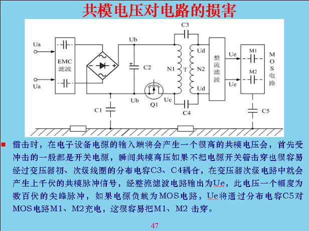 下面講一下共模電壓對(duì)電路的損害。其實(shí)共模電壓對(duì)開(kāi)關(guān)電容前面的影響不是很大,最大是后面一點(diǎn),通過(guò)電壓器分布電路,以前的模式電路電壓用得很低,都是1v-5v左右,納米級(jí)容易擊穿,電容也相當(dāng)小。從里面串進(jìn)去的電壓經(jīng)過(guò)濾波不斷的吸收降下來(lái),一般有上千伏,容易把后面的擊穿。在實(shí)踐過(guò)程中為了防雷,這幾個(gè)位置最好在上面布一個(gè)雷點(diǎn)電容,對(duì)防雷電擊穿很有效。共模電壓進(jìn)去以后瞬間擊穿,如果電子沒(méi)斷開(kāi),外面的電流會(huì)繼續(xù)延續(xù)下去把它燒掉,如果備一個(gè)電容上去,共模電容通過(guò)電容一下子把它吸收掉,讓幾個(gè)電容互相通電位,幾個(gè)模組不會(huì)那么容易擊穿。