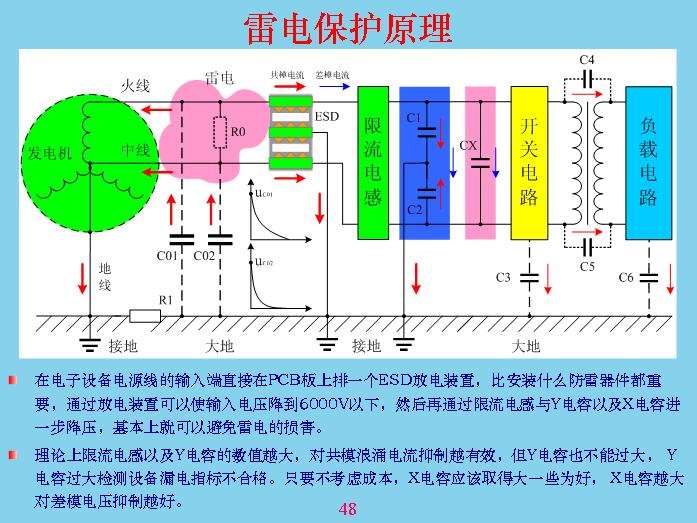 大家想想看,跟前面我們所說(shuō)的,感應(yīng)雷這個(gè)東西沒(méi)有一個(gè)標(biāo)準(zhǔn)的概念說(shuō)什么叫做感應(yīng)雷。只要打雷的話(huà),外面打雷,窗戶(hù)上面的金屬,如果夜間都可以看到放電產(chǎn)生火花,這就是通過(guò)電磁感應(yīng)產(chǎn)生的位移電流原理。從原理上來(lái)說(shuō),三相四線(xiàn)或三相五線(xiàn),發(fā)電機(jī)有中線(xiàn)接地,設(shè)備使用者的外殼接地是最有效的避雷方法,但現(xiàn)在很多設(shè)備都不接地,沒(méi)有辦法接,只有很貴重的進(jìn)口設(shè)備用三相電源,中間那一條地線(xiàn),地線(xiàn)不是中線(xiàn),大家要搞清楚。中線(xiàn)雖然是接地的,但在這里不能當(dāng)成地線(xiàn),地線(xiàn)一定是自己大樓本身的地,而且要量好接地的地線(xiàn)。因?yàn)榈鼐€(xiàn)接進(jìn)去以后,大樓對(duì)外面的電磁層進(jìn)行屏蔽了,大樓相對(duì)來(lái)說(shuō)也是導(dǎo)電的,就算不導(dǎo)電,現(xiàn)在國(guó)家都有安全要求,大樓超過(guò)多少層都要加上避雷針,就是防雷的。如果不能接地,你就要考慮充放電的問(wèn)題。前面最好的共模電容我覺(jué)得還是要,我認(rèn)為這個(gè)共模電容最好連接上,不能接大地,要接在外殼上,接到外殼上有什么好處?共模電壓一進(jìn)來(lái),雖然電流沒(méi)有通過(guò)地放電回路,把電壓舉高起來(lái)了,與外面輸入電壓是一樣的,外殼電壓取的一樣,起到了屏蔽作用。如果這個(gè)接地的話(huà)會(huì)更加安全,但是地線(xiàn)要足夠粗,回路也足夠,因?yàn)榉烹姷碾娏骱艽螅苋菀谉?。這幾個(gè)東西是經(jīng)過(guò)很多年的試驗(yàn),8是很成熟的東西,不管做共模還是防雷都要做上,如果連機(jī)殼都沒(méi)有,只是塑料殼,也要考慮這根線(xiàn)接到什么位置最好?是接到里面面積最大的地方,就是公共地面積最大的地方,讓電位舉起來(lái),其他電位差不會(huì)產(chǎn)生很大的電容回路。主要是考慮充放電回路,電流越小越好,兩個(gè)電位差越小越好。