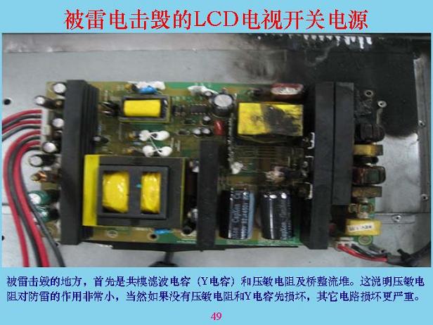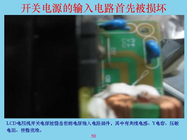 下面我們講一些具體的。這是一個(gè)開(kāi)關(guān)電源,開(kāi)關(guān)電源被雷劈的時(shí)候,輸入回路基本上都燒了,假如沒(méi)燒是什么樣的?可以看看,這是橋堆,這兩個(gè)是Y電容,這里面還有一個(gè)壓敏電阻。這是共模線(xiàn)圈,雷劈以后全部燒了,說(shuō)明壓敏電阻沒(méi)有起到什么保護(hù)作用,兩個(gè)電容都燒了,說(shuō)明電感相當(dāng)、相當(dāng)?shù)馗?。為了防止雷電,首先前面一定要加一個(gè)能量吸收,比較大的東西,成本相對(duì)來(lái)說(shuō)比較低,像試驗(yàn)站里面的放電裝置,那個(gè)東西沒(méi)有地方裝,也貴得很。在硬紙板上面排幾個(gè)鋸齒,中間隔一個(gè)頭就行了。如果中間隔6mm也可以。有一個(gè)一級(jí)電感,電感可以使瞬間上去很快的電壓降下來(lái),突然加一個(gè)1萬(wàn)伏、10萬(wàn)伏,加上去只有這兩端,另外兩端建立不起來(lái),所以剛加進(jìn)去的時(shí)候?qū)纂妬?lái)說(shuō),大部分能量都被吸收掉了。后面經(jīng)過(guò)這個(gè)以后,剩余部分通過(guò)共膜電容繼續(xù)吸收,吸收完以后還有差模部分,產(chǎn)生的差模部分通過(guò)電容把差模吸收掉。共模電容和差模電容具有抑制傳導(dǎo)干擾的作用,對(duì)雷電也有抑制作用,所以很多人也在問(wèn),電容接到前面好還是接在后面好?這個(gè)東西看你有什么作用,如果只是為了防EMI電磁干擾的話(huà),接在越前面越好,接在測(cè)試儀表的輸入端最好,接到那里把信號(hào)全部短路掉了,就看不到了。但是對(duì)于雷電,你接到后面要好很多,所以這主要是防雷的,你就不要考慮電磁干擾和EMC了,盡量把兩個(gè)放在后面。