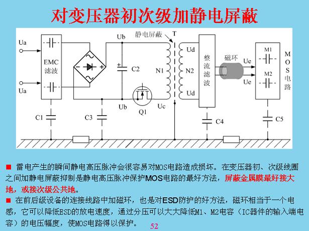 對(duì)于一些比較貴重的儀器、設(shè)備,在開(kāi)關(guān)電容電壓器這里最好做靜電比例,在初次級(jí)線(xiàn)圈中間做一個(gè)鋁箔片都可以,包一層,這層不能短路,短路的話(huà)變壓器就會(huì)燒掉,包在外面可以短路,包在里面不能短路,包在外面吸收漏電電感,包在里面的主回路里面會(huì)短路,然后把它進(jìn)行接地,這相當(dāng)于可以隔離掉。這個(gè)有一個(gè)教訓(xùn),前段時(shí)間康佳臺(tái)灣裝LCD屏測(cè)試,打了一個(gè)隔離變壓器,后面就是接測(cè)試儀表,每個(gè)月都有一臺(tái)、兩臺(tái)測(cè)試儀表?yè)p壞,查不出原因,最后讓他們把隔離變壓器的中間屏蔽才好。屏蔽以后,進(jìn)一步有機(jī)會(huì)的話(huà),在接頭有連接的地方加一個(gè)磁環(huán),讓共模電壓將磁環(huán)速度放慢,緩沖一下,讓瞬間能量降低,瞬間能量緩慢一點(diǎn),慢慢的過(guò),損傷就會(huì)少很多。所有電路都可以把它看成一個(gè)分布電流,只要某地方電壓電位在改變,對(duì)后面都會(huì)產(chǎn)生充放電,從這上面理解就知道了,如果哪個(gè)地方構(gòu)成回路,如果有一個(gè)高電壓進(jìn)來(lái)一直傳導(dǎo)到后面,最后充電,充電可以理解成分布電容,如果沒(méi)有這個(gè)也有一個(gè)分布電容在里面,把分布電容放在這里,就比較形象地。就像以前的絕緣長(zhǎng)效濾管一樣,手一摸沒(méi)有造成回路也壞掉了,絕緣的濾管很容易壞,一從里面拿出來(lái),手一摸就壞掉,一個(gè)身上面帶正電,或者你作為天線(xiàn)有感應(yīng)電壓,感應(yīng)一下來(lái)回充放電就壞掉了。