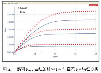 利用這種工具套件,研究人員可以同時進行直流和脈沖IV測試以掌握器件特性,例如如圖2所示的FET器件系列特征曲線。