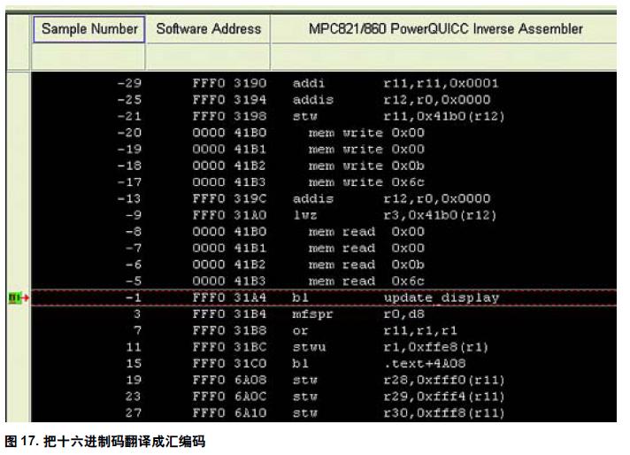 在使用處理器時(shí),特定的十六進(jìn)制字符包含一個(gè)處理器指令。如果您很熟悉十六進(jìn)制代碼,就能查看這些類似圖13 所示的十六進(jìn)制代碼表,并知道它們代表的指令。但我們大部分人做不到這一點(diǎn)。因此,絕大多數(shù)分析儀制造商設(shè)計(jì)了稱為反匯編器的軟件包。這些軟件包把十六進(jìn)制代碼轉(zhuǎn)換成易于閱讀的匯編碼。例如圖13中有0000 41B0 和0000 41B1。我們可以從MotorolaPowerQUICC 手冊(cè)中查到它們代表存儲(chǔ)器寫0x00 指令。反匯編器可以為我們做這些事情,使我們不需要查找這些代碼。請(qǐng)查看圖17 并注意它們之間的差別。