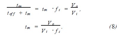 可以認為Δi就是電感線圈中的紋波電流,將導通和關(guān)斷狀態(tài)時的時間和電壓式(2)和式(3)代入上式,分別寫出導通狀態(tài)和關(guān)斷狀態(tài)時的紋波電流表達式: