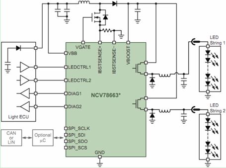 安森美半導(dǎo)體針對LED汽車前照燈系統(tǒng)開發(fā)了NCV78663電源鎮(zhèn)流器及雙LED驅(qū)動器。NCV78663是先進(jìn)的高可靠性、高能效的系統(tǒng)級芯片(SoC) LED驅(qū)動器,支持達(dá)2 A電流,提供高于90%的總能效,驅(qū)動高達(dá)60 V電壓的多串LED,能以PWM調(diào)光維持色溫及控制平均電流,使設(shè)計(jì)人員能夠以一顆高集成度的SoC控制遠(yuǎn)光燈及近光燈、日間行車燈、轉(zhuǎn)向指示燈及霧燈,所需外部元件極少。這器件通過SPI接口與外部微控制器通信,在上電后動態(tài)地控制系統(tǒng)參數(shù)、檢測LED工作狀態(tài)并反饋診斷信息。圖4顯示的是NCV78663在先進(jìn)的汽車前照燈應(yīng)用中的電路圖。