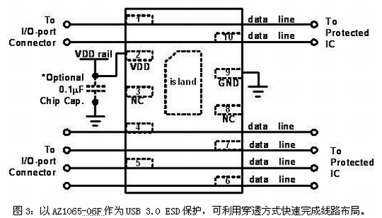 AZ1065系列產(chǎn)品提供了六個極低電容的引腳,可同時保護USB 3.0的兩組差動對(TX和RX)及USB 2.0的差動對(D+和D-),具有減小PCB面積和降低布局復(fù)雜度等優(yōu)點,并可大幅節(jié)省系統(tǒng)成本。更特別的是,AZ1065-06F率先采用交錯型的引腳,以便PCB布局時可利用穿透式(Feedthrough)方式實現(xiàn)完美設(shè)計,圖3顯示了AZ1065-06F的接線方式。