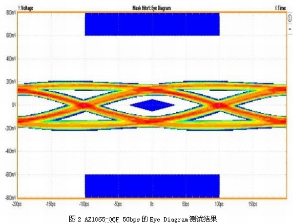 在IEC 61000-4-2接觸模式6kV(TLP電流等效約為17A)的ESD攻擊下,箝制電壓僅有13.4V,足以有效避免系統(tǒng)產(chǎn)品在靜電測試時發(fā)生數(shù)據(jù)錯誤、當(dāng)機甚至損壞的情況。圖2所示為裝有ESD保護組件AZ1065-06F的USB 3.0端口順利通過5Gbps的眼圖測試結(jié)果。