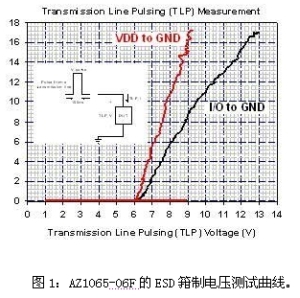 最重要是,與相同的寄生電容相比,AZ1065擁有最低的ESD箝制電壓,可有效防止數(shù)據(jù)傳輸時被ESD事件干擾,這樣才能讓具有USB 3.0連接端口的電子系統(tǒng)得以通過Class-A的IEC 61000-4-2系統(tǒng)級靜電放電保護測試。利用傳輸線脈沖系統(tǒng)(TLP)測量AZ1065-06F后,可以觀察到如圖1所示的ESD箝制電壓特性。