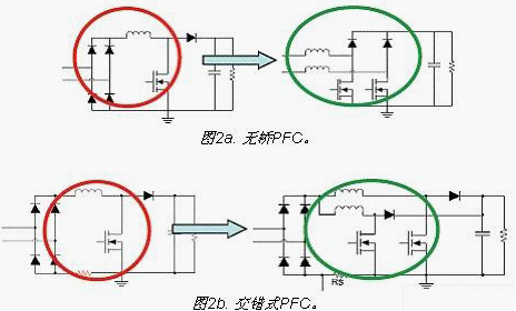 改善PFC能效的目標(biāo)是為了實(shí)現(xiàn)功率因數(shù)校正短的效率達(dá)到96%以上。采用無橋PFC(圖2a)可以減少橋損耗,采用交錯(cuò)式PFC(圖2b)可以滿足較高功率應(yīng)用的要求,以提升PFC能效。此外,還可以利用IC技術(shù)減少開關(guān)損耗,并利用更優(yōu)化的拓?fù)浣Y(jié)構(gòu)來減少EMI濾波器損耗。