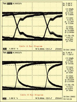 圖4是實(shí)際應(yīng)用的眼圖情況,很明顯電纜B的眼圖要比電纜A的眼圖要好,和前面的仿真結(jié)果比較吻合,不過(guò)電纜A的實(shí)際反射比較大一點(diǎn),這和仿真使用驅(qū)動(dòng)器件的模型有關(guān)。