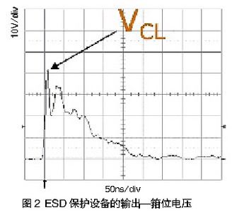 圖2所示的是一次ESD事件中,ESD保護(hù)設(shè)備的輸出(箝位電壓)。