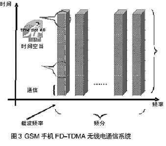 GSM(全球通)手機(jī)標(biāo)準(zhǔn)使用頻分多路傳輸和時(shí)分多路傳輸,同時(shí)傳送大量電話,如圖3所示。