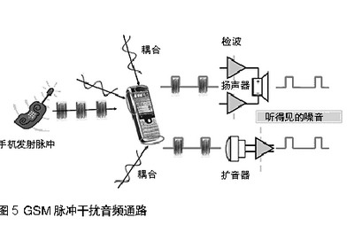 當(dāng)手機(jī)與基站通訊,或兩個(gè)手機(jī)彼此接近時(shí),發(fā)射脈沖通過擴(kuò)音器,揚(yáng)聲器,或頭戴式耳機(jī)線傳人音頻通路。見圖5。