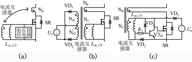 圖7為幾種典型的電流型驅(qū)動(dòng)方案。傳統(tǒng)的電流型驅(qū)動(dòng)方案如圖7(a)所示,整個(gè)驅(qū)動(dòng)電路包括一個(gè)電流互感器(CT)和一個(gè)電壓箝位電路。電路通過電流互感器對電流信號進(jìn)行采樣,并給同步管提供相應(yīng)的驅(qū)動(dòng)信號,多余的驅(qū)動(dòng)能量被箝位電路消耗。該驅(qū)動(dòng)電路比較簡單,但是有較大的驅(qū)動(dòng)損耗,限制了變流器效率的提高。因此有文獻(xiàn)提出了具有剩余驅(qū)動(dòng)能量回饋功能的電流型驅(qū)動(dòng)方案,如圖7(b)所示。該驅(qū)動(dòng)電路中多余的驅(qū)動(dòng)能量能通過輔助繞組回饋到主電路,從而可以較大的減少驅(qū)動(dòng)電路的損耗,并簡化電流互感器的設(shè)計(jì),但是多繞組的電流互感器大大增加了生產(chǎn)成本。另有文獻(xiàn)提出了一種更為簡單的電流型驅(qū)動(dòng)方案,如圖7(c)所示。該方案的電流互感器只需一個(gè)副邊繞組,同時(shí)也具有剩余驅(qū)動(dòng)能量回饋的功能,更加有利于實(shí)際的生產(chǎn)應(yīng)用。通過三極管VTd1,它可以準(zhǔn)確地檢測同步整流管應(yīng)該關(guān)斷的時(shí)刻,從而保證了同步整流電路的可靠性。