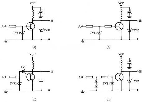各種瞬變電壓能使晶體管的EB結(jié)或CE結(jié)擊穿而損壞,特別是晶體管集電極有感性(線圈、變壓器、電動機(jī))負(fù)載時(shí),通常會產(chǎn)生高壓反電勢,因而可能使晶體管損壞。在實(shí)際應(yīng)用中,建議采用TVS作為保護(hù)器件。圖3所示為TVS保護(hù)晶體管的四種電路實(shí)例。