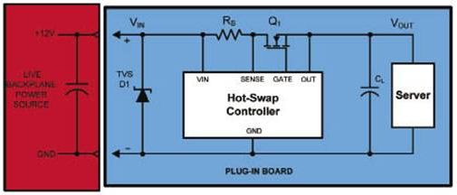 在熱插拔應(yīng)用中,TVS主要用作需要被中斷的差模電流的接地分流路徑。熱插拔系統(tǒng)常被用在分布式電源系統(tǒng)中提供可靠的系統(tǒng)保護(hù)和電氣管理,典型服務(wù)器系統(tǒng)的線卡接口和熱插拔電路原理圖如圖5所示。