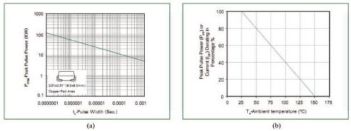 對瞬變電壓的吸收功率(峰值)與瞬變電壓脈沖寬度間的關(guān)系。手冊給的只是特定脈寬下的吸收功率(峰值),而實(shí)際線路中的脈沖寬度則變化莫測,事前要有估計(jì)。對寬脈沖應(yīng)降額使用。