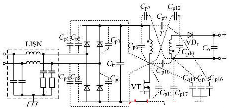 圖2反激式開關(guān)電源寄生電容典型的分布