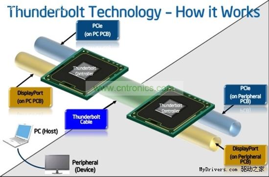 Thunderbolt接口由一顆Intel控制芯片驅(qū)動(dòng),通過PCI-E x4、DisplayPort總線與系統(tǒng)芯片組相連,也可以直接連接Intel處理器內(nèi)集成的圖形核心進(jìn)行DisplayPort輸出。