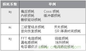 表1概括總結(jié)了各種電源損耗項(xiàng)及其相關(guān)損耗系數(shù),該表提供了一些最佳化電源效率方面的折中方法。例如,功率MOSFET導(dǎo)通電阻的選擇會影響其柵極驅(qū)動要求及Coss損耗和潛在的緩沖器損耗。低導(dǎo)通電阻意味著,柵極驅(qū)動、Coss 和緩沖器損耗逆向增加。因此,您可通過選擇MOSFET來控制a0和a2。