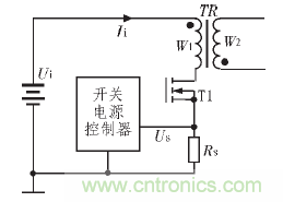 開(kāi)關(guān)電源從控制方式上可分為電壓控制型和電流控制型,從隔離變壓器的驅(qū)動(dòng)方式上可分為單端型和雙端型。在這些電路形式中, 許多形式的開(kāi)關(guān)電源需要使用電流傳感器檢測(cè)電流,或者用于脈沖占空比的控制,或者用于電路的保護(hù)。電流控制型開(kāi)關(guān)電源直接對(duì)輸入的脈沖電流進(jìn)行檢測(cè),能同時(shí)根據(jù)輸入電壓和輸出電壓的變化綜合調(diào)節(jié)脈沖占空比,具有動(dòng)態(tài)響應(yīng)速度快,輸入電壓的波動(dòng)對(duì)輸出電壓影響小等特點(diǎn)。電流控制型開(kāi)關(guān)電源中需要電流傳感器檢測(cè)輸入的脈沖電流, 以作為開(kāi)關(guān)電源調(diào)節(jié)脈沖占空比、穩(wěn)定輸出電壓的反饋信號(hào)。圖1 所示為一個(gè)電流控制型的反激式開(kāi)關(guān)電源的輸入通道原理圖。圖中電阻RS在電路中的作用即是電流傳感器, 在功率開(kāi)關(guān)T1導(dǎo)通時(shí), 流過(guò)隔離變壓器原邊繞組W1的電流Ii將使RS上產(chǎn)生電壓降US,US即為向開(kāi)關(guān)電源控制器反饋的輸入電流值信號(hào)。根據(jù)輸出電壓反饋信號(hào)和輸入電流值反饋信號(hào)US, 開(kāi)關(guān)電源控制器將綜合調(diào)節(jié)電路的脈沖占空比,保證輸出電壓的穩(wěn)定。