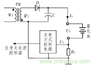 為了提高開(kāi)關(guān)電源工作的可靠性,防止輸出電流過(guò)流等情況發(fā)生,許多開(kāi)關(guān)電源在輸出端接入電流傳感器,檢測(cè)輸出電流的大小,一旦輸出電流超過(guò)設(shè)計(jì)標(biāo)準(zhǔn),保護(hù)電路即采取必要措施保護(hù)開(kāi)關(guān)電源的安全[3]。此外,當(dāng)開(kāi)關(guān)電源作為蓄電池充電器時(shí),也需要檢測(cè)輸出電流的大小,以此了解蓄電池的充電情況,適時(shí)切換充電方式,達(dá)到提高充電效率,延長(zhǎng)蓄電池的使用壽命的效果。圖3 為一個(gè)蓄電池充電器的輸出電流檢測(cè)原理圖, 電流檢測(cè)電阻RS將蓄電池的充電電流轉(zhuǎn)化為電壓US,反饋給充電方式控制電路,由控制電路根據(jù)充電電流的大小適時(shí)切換充電方式[4]。
