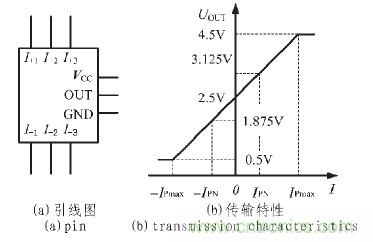 常用的TBC-DS 系列閉環(huán)霍爾電流傳感器的引線框圖和傳輸特性如圖5 所示[6]。圖5(a)所示的霍爾電流傳感器引線中,I+1~3和I-1~3是被測(cè)電流的串入繞組引腳, 其中,I+1和I-1是一個(gè)被測(cè)電流繞組的引腳,I+2和I-2、I+3和I-3也分別各是一個(gè)被測(cè)電流繞組的引腳。當(dāng)3 個(gè)被測(cè)電流繞組并聯(lián)時(shí),霍爾電流傳感器的額定測(cè)量電流為IPN1; 若將兩個(gè)繞組并聯(lián)再與一個(gè)繞組串聯(lián)時(shí),霍爾電流傳感器的額定測(cè)量電流為IPN2;若將3 個(gè)繞組相互串聯(lián)時(shí),霍爾電流傳感器的額定測(cè)量電流為IPN3。3 個(gè)額定測(cè)量電流間的關(guān)系為:IPN1=2 IPN2=3 IPN3??梢?jiàn),通過(guò)3 組被測(cè)電流繞組的不同接法,可以改變霍爾電流傳感器的額定測(cè)量電流值,擴(kuò)展測(cè)量區(qū)間。VCC為電源引腳,電源電壓通常為5 V;GND 是電源和傳感器輸出電壓的地;OUT 是傳感器電壓輸出引腳。由5(b)所示的霍爾電流傳感器傳輸特性可見(jiàn),當(dāng)被測(cè)電流為0 時(shí),其輸出電壓UOUT =2.5 V;當(dāng)被測(cè)電流不為0 且方向?yàn)閺腎+至I-時(shí),輸出電壓UOUT>2.5 V,當(dāng)被測(cè)電流不為0 且方向?yàn)閺腎-至I+時(shí),輸出電壓UOUT<2.5 V。IPN和-IPN是霍爾傳感器的正負(fù)額定電流, 當(dāng)被檢測(cè)電流達(dá)到額定電流時(shí),根據(jù)電流方向的不同,輸出電壓UOUT 的值分別為3.125 V 或1.875 V, 即相對(duì)于2.5 V 的中心值有±0.625 V的偏移。當(dāng)被檢測(cè)電流值絕對(duì)值大于IPN 時(shí),霍爾傳感器仍可輸出與被檢測(cè)電流成線性關(guān)系的電壓值,直至被檢測(cè)電流達(dá)到霍爾傳感器的最大檢測(cè)電流IPmax。通常,IPmax>3 IPN。