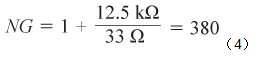 電阻R4使跨導(dǎo)放大器的噪聲增益保持在合理水平。R4的值需權(quán)衡兩個因素:噪聲增益的幅度和暴露于高濃度氣體時傳感器的建立時間誤差。對于本電路,R4 = 33 Ω,由此可計算噪聲增益等于380,如公式4所示。