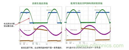 在CCM應(yīng)用中,當(dāng)初級(jí)端MOS管導(dǎo)通時(shí),通過(guò)隔離驅(qū)動(dòng)器強(qiáng)制使次級(jí)端MOS管關(guān)斷;當(dāng)初級(jí)端MOS管關(guān)斷, TRIG腳功能使次級(jí)端MOS管導(dǎo)通。這種交替導(dǎo)通特性大大提高系統(tǒng)能效。如圖5所示,無(wú)觸發(fā)功能的初級(jí)端和次級(jí)端驅(qū)動(dòng)信號(hào)交疊的時(shí)間為40 ns,遠(yuǎn)大于帶觸發(fā)功能的12 ns,也就是說(shuō),觸發(fā)功能將縮短延遲時(shí)間,從而降低損耗。