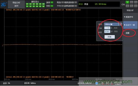 第三步,點(diǎn)擊圖 3菜單中“測(cè)量”區(qū)域,使界面出現(xiàn)“測(cè)量”字樣,此時(shí)儀器界面中的波形會(huì)停止刷新。然后通過(guò)“自動(dòng)下一幀”菜單,選擇要查看的波形幀數(shù),可以選擇從第一幀開(kāi)始,到最后一幀介紹,然后設(shè)定每一幀的回放速度(從人眼的反應(yīng)考慮,建議選擇200ms/幀以上),點(diǎn)擊開(kāi)始之后,界面中的波形會(huì)進(jìn)行回放,當(dāng)看到想要看的波形后按停止按鍵,然后通過(guò)“數(shù)據(jù)序號(hào)”來(lái)調(diào)整波形,確??吹阶约合胍牟ㄐ?,如圖 4所示;