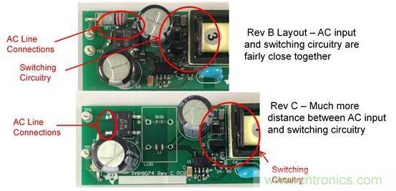 圖2.從電路板布局進(jìn)行 EMI 掃描,其中 AC 輸入與開關(guān)電路距離較近