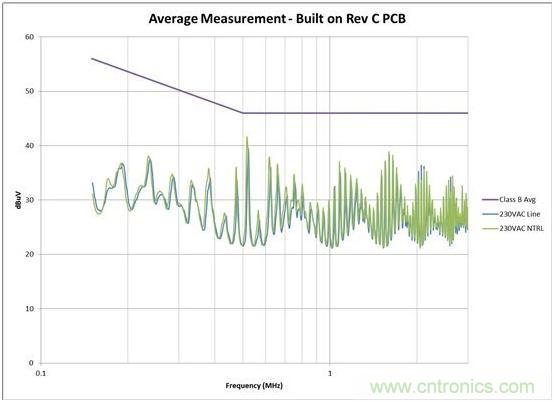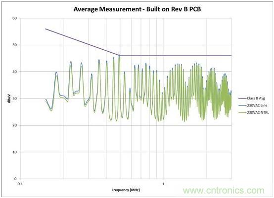 我通過簡單調(diào)整電路板(無電路變化),將噪聲降低了大約 6dB。見圖 2 和圖 3 的測量結(jié)果。在有些情況下,接近高 dV/dt 進(jìn)行輸入線路布線甚至還可擊壞共模線圈 (CMC)。