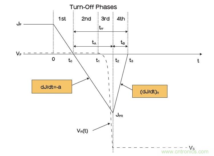 當(dāng)二極管正向偏壓變成反向偏壓時,電流不會立即降至零值,因為消除通態(tài)期間儲存的電荷需要時間。因此,當(dāng)t=t0時,二極管開始換向操作,電流開始下降,下降斜率(-a)恒定,外部電感和電源電壓是決定斜率的唯一因素。在t1之前,二極管被施加正向偏壓,從t1到t2,二極管壓降上升,達(dá)到電源電壓;在t=t2時,反向電流達(dá)到最大值。間隔(t3-t0)被稱為反向恢復(fù)時間(trr),而負(fù)電流與零線之間的區(qū)域是反向恢復(fù)電荷(Qrr)。tB期間的電流斜率主要與產(chǎn)品設(shè)計和硅特性有關(guān)。