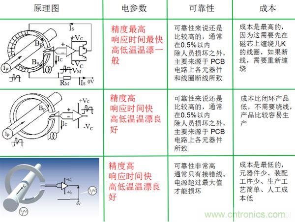 注:閉環(huán)電流傳感器、開(kāi)環(huán)電流傳感器、電動(dòng)汽車(chē)電流傳感器對(duì)比圖