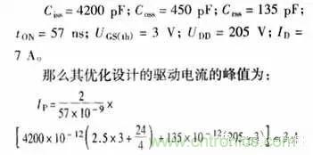 UGS第一段是快速上升到門限電壓;UGS第二段是比較緩的上升速度以減慢漏極電流的上升速度,但此時的UGS也必須滿足所需的漏極電流值;UGS第四段快速上升使漏極電壓快速下降;UGS第五段是充電到最后的值。當(dāng)然,要得到完全一樣的驅(qū)動波形是很困難的,但是可以得到一個大概的驅(qū)動電流波形,其上升時間等于理想的漏極電壓下降時間或漏極電流上升的時間,并且具有足夠的尖峰值來充電開關(guān)期間的較大等效電容。該柵極尖峰電流IP的計算是:電荷必須完全滿足開關(guān)時期的寄生電容所需。