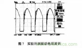根據(jù)如前所述,驅(qū)動電壓、電流的理想波形不應(yīng)該是一條直線,而應(yīng)該是如圖6所示的波形。實(shí)驗(yàn)波形見圖7。