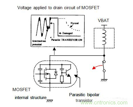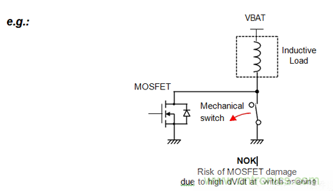 當MOSFET處于關閉狀態(tài)時,開關的開啟會導致MOSFET的破壞:由于機械開關的短暫時間,高的dvdt會激活在MOSFET中包含的寄生晶體管。浪涌的能量將集中在這種寄生晶體管上;這可以破壞寄生雙極晶體管,并破壞MOSFET本身。MOSFET在漏極源和源極之間的絕對短路損壞。