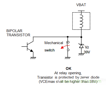 1.使用一個雙極晶體管,用一個穩(wěn)壓二極管保護來限制振蕩電壓,其值低于VCEmax。39vzener電壓是接受拋負載的推薦值。