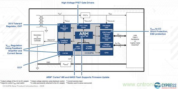 如圖2所示,CCG3PA具有高集成度,與通過使用分立組件實現(xiàn)的功能等效系統(tǒng)相比,具有組件數(shù)量更少、電路板占位面積更小、電路板布局更簡單以及材料成本和PCB成本更低的優(yōu)勢。