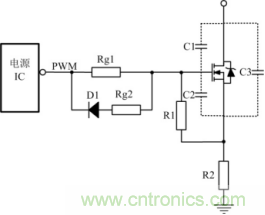 關(guān)斷瞬間驅(qū)動(dòng)電路能提供一個(gè)盡可能低阻抗的通路供MOSFET柵源極間電容電壓快速泄放,保證開關(guān)管能快速關(guān)斷。為使柵源極間電容電壓的快速泄放,常在驅(qū)動(dòng)電阻上并聯(lián)一個(gè)電阻和一個(gè)二極管,如圖3所示,其中D1常用的是快恢復(fù)二極管。這使關(guān)斷時(shí)間減小,同時(shí)減小關(guān)斷時(shí)的損耗。Rg2是防止關(guān)斷的時(shí)電流過(guò)大,把電源IC給燒掉。