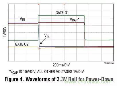 圖 4 示出了失去 3.3V 電壓軌時的波形。當(dāng)輸入電壓下降時,Q2 的柵極電壓保持不變 (接近于地電位),而且 Q2 處于關(guān)斷狀態(tài)。與此相反,Q1 的柵極電壓則急劇上升至 3.3V。這把 Q1 關(guān)斷,由 Q1 的體二極管起隔離二極管的作用,從而使負(fù)載與輸入分離。此時備份電源接管供電,LTC3643 通過釋放存儲電容器的電能以給關(guān)鍵的負(fù)載提供3.3V。