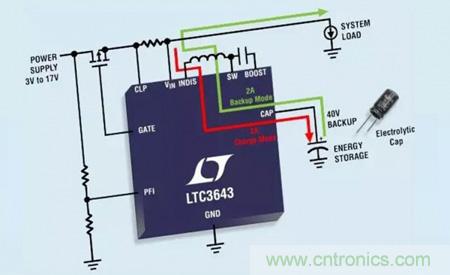 于是,就有了 LTC3643,它能使我們采用一種相對便宜的儲能元件——低成本電解電容器。本文將介紹的是一款電路,它使 LTC3643 用作針對 3.3V 電壓軌的備份電源解決方案。